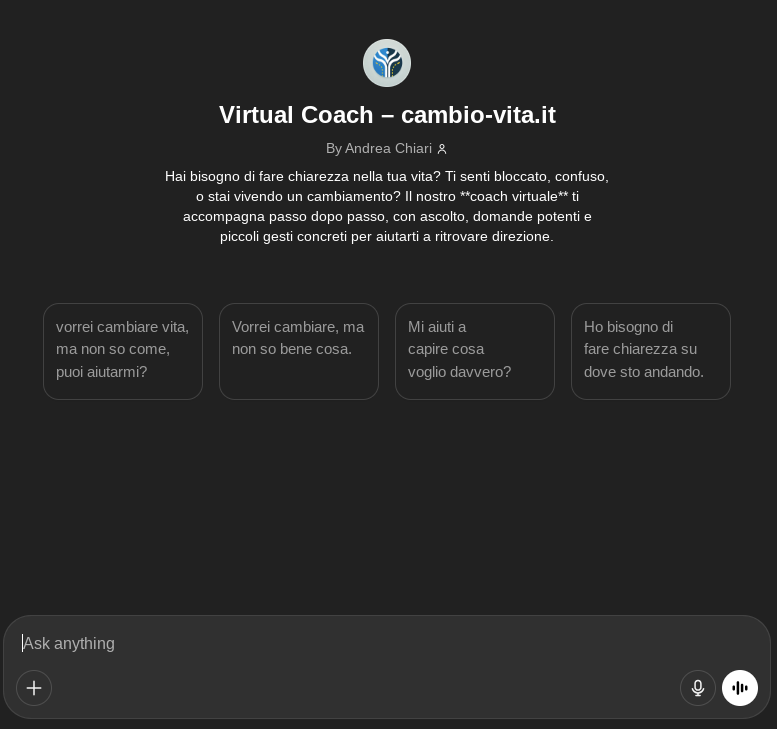 Hai un momento di blocco o confusione? Il Virtual Coach ti accompagna con domande potenti, ascolto autentico e supporto mirato. Gratis e subito disponibile.